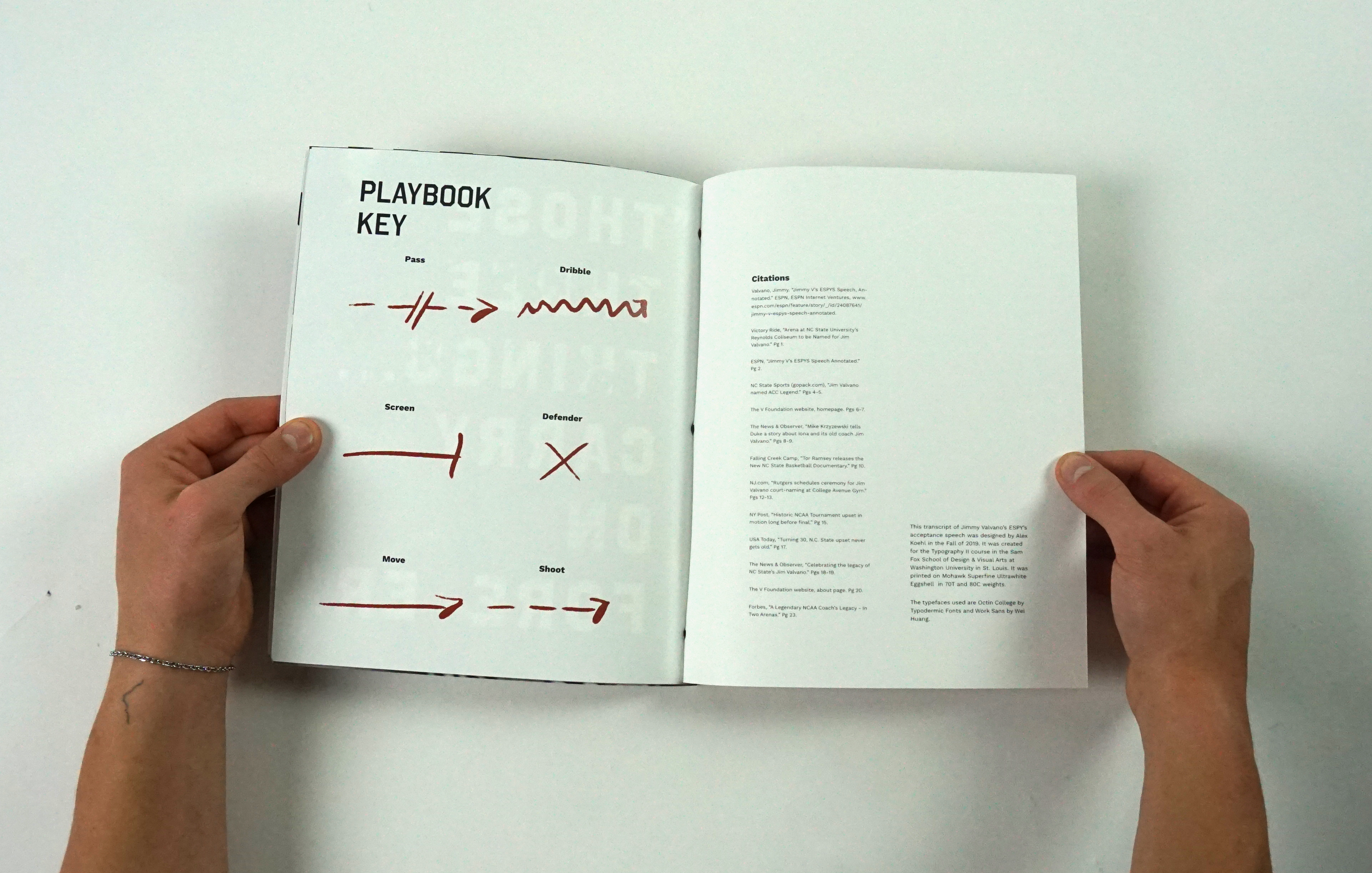 In this editorial design project, I was asked to pick a speech and design a book for the transcript. I chose former NC State basketball coach, Jimmy Valvano’s, acceptance speech of the Arthur Ashe Courage Award at the 1993 ESPYS. The terminally ill Jimmy V used the platform to announce the establishment of The V Foundation for Cancer Research. He passed one one month later, but his legacy has been immortalized in the 11 impactful and inspirational minutes of this speech. I printed this project during the 2019 V Week, The V Foundation’s annual fundraising push week.